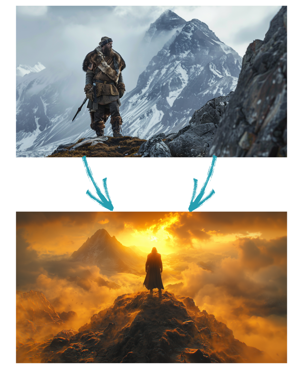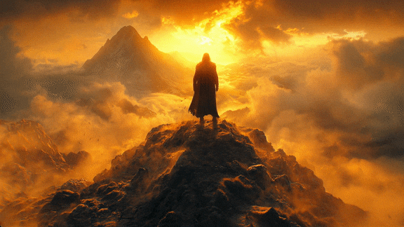 "A lone warrior standing on a misty mountain peak, epic scene, dramatic atmosphere, golden hour lighting, volumetric fog, ultra detailed, cinematic composition, 85mm lens"